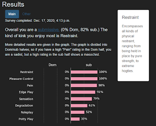 Eerst zat F me een beetje te pesten, hardop te bedenken wat ie zou gaan doen vandaag. Hij had kennelijk goed mijn profiel op FL bekeken (beter dan ik zelf op dat moment voor ogen kon halen). Wel handig natuurlijk, want ik zet daar wel eens wat neer aan fetishes, of ik like foto’s van anderen (misschien toch maar niet meer doen… 😘). Ik kon het me niet meer herinneren, maar recentelijk had ik een leuk testje gedaan op https://kinktest.co.uk/ en daar kwam dit resultaat uit: