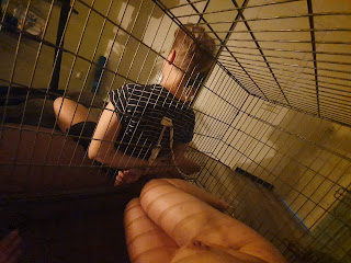 Overdag is dinnetje gelocked en wel bij een andere vriendin en omdat zij het daarmee natuurlijk best zwaar heeft, verzint Meester voor mij ook een opdracht. Nou ja zelf verzinnen, dat had dinnetje natuurlijk al als voorzet gegeven. Ik moet een uur in de bench, terwijl zij vastzit aan de buitenkant van de bench. Dat laatste vind ik dan weer extra sneu voor haar, want ik weet niet of ze dat zo lang volhoudt.